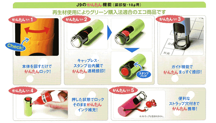 キャップレスタイプで、にじまず何回でも押せます。印面はゴム印なのでシャープな印影です。インキの目詰まりがなく、感熱紙などの紙質を選びません。